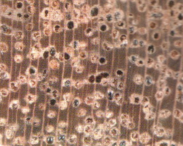 心邊材區刖路明顯、心材灰紅褐色至紅褐色。久則轉為巧克力色。邊材淺灰褐色、寬5~10cm,生長輪不明顯。