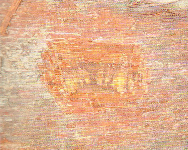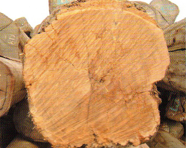 心邊材區別明顯。心材淺黃褐色,久則轉為巧克力褐色。邊材窄,金黃色。生長輪略可見。