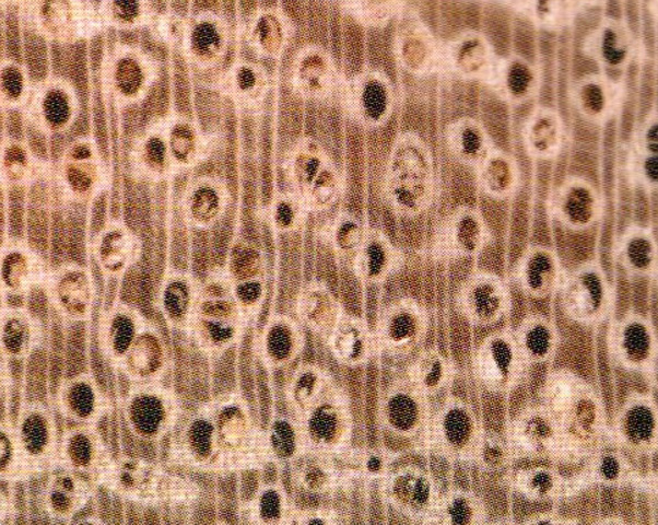 散孔材。管孔肉眼下明顯少而略大;主為單管孔,少數徑列復管孔(2~3個);含淺色臘質沉積物和褐色樹膠。軸向薄壁組織肉眼下可見,發達,環管狀、翼狀,聚翼狀及輪界狀。木射線放大鏡下明顯,密度中。窄。
