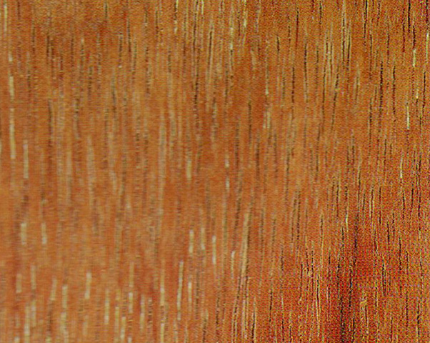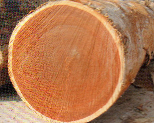 心邊材區別極明顯、心材暗紅褐色,略具深色條紋、邊材淡黃白色,厚3~4 cm。生長輪略明顯。