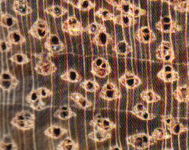 散孔材。管孔肉眼下明顯,少,略大;主為單管孔,少數經列或斜列復管孔(2~3個);具黑色樹膠及硫黃色沉積物。軸向薄壁組織肉眼下明顯,發達,翼狀、聚翼狀及輪界狀。木射線放大鏡下明顯,密度中,甚窄。